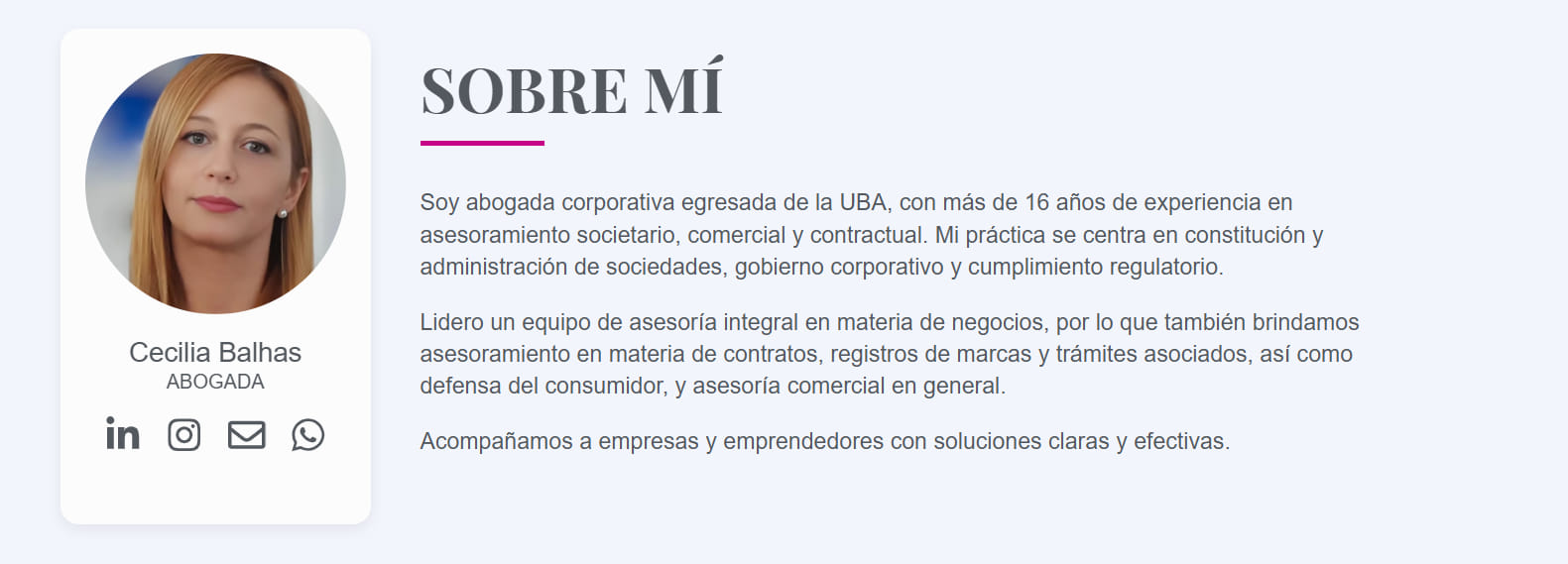 El sitio presenta secciones claras —“Asesoramiento societario”, “Radicación e internacionalización”, “Compliance”, “Contratos y comercial” — que reflejan la diversidad de servicios que ofrece Asesorías Balhas. Esto facilita que los visitantes comprendan rápidamente la oferta y accedan a los contenidos clave.